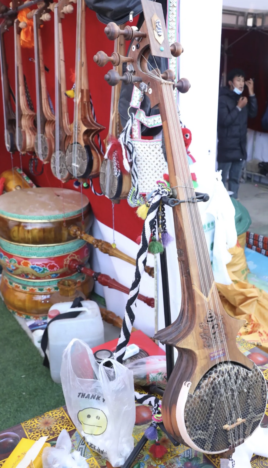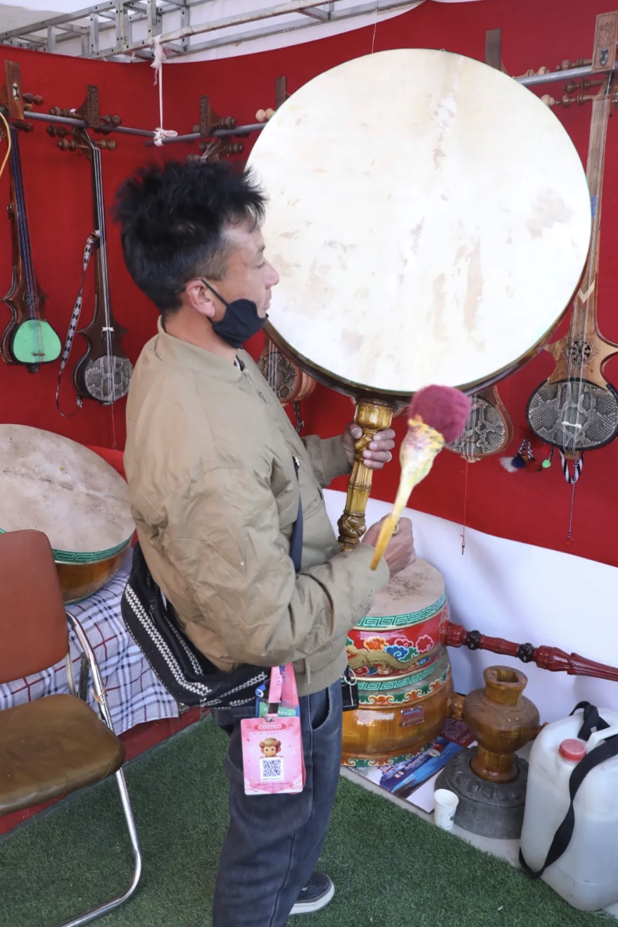 “要买扎念和鼓吗?都是纯手工制作的。”加查县县级非物质文化遗产代表性项目拉绥扎念琴制作技艺传承人次仁多吉一边敲击着手中的鼓,一边向来往的顾客吆喝着。