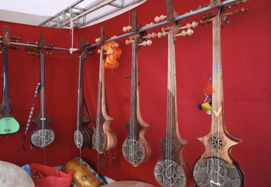 作为西藏历史悠久、流传广泛的民族传统乐器,扎念藏语意为“悦耳动听之声”。次仁多吉介绍道,纯手工制作的扎念琴,由共鸣箱、琴头、琴杆、弦轴、马子和琴弦等部分组成,琴身一般使用桑木、桦木、松木以及核桃木制作而成,经过刨削、雕镂、蒙皮等20余道精细工序制成,琴身上的木纹细腻自然、彩绘藏式图案生动鲜活,每一把琴都蕴含着匠人的智慧与汗水。