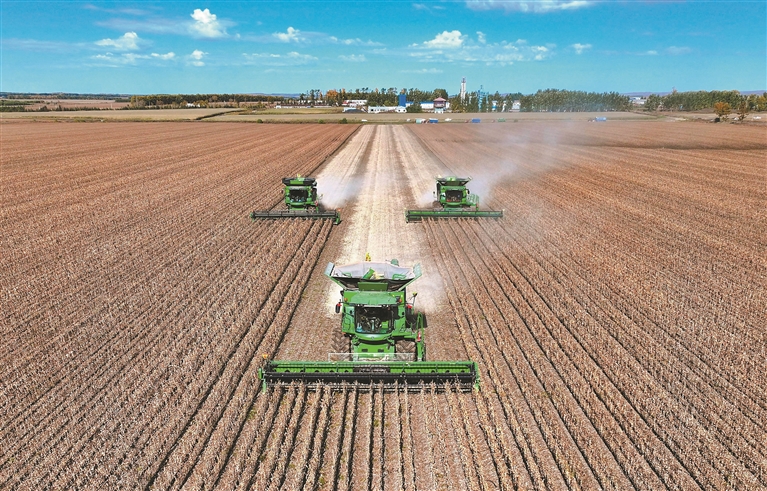 图为9月29日,在北大荒集团黑龙江尾山农场有限公司第一管理区,农机进行大豆收获作业(无人机照片)。新华社发