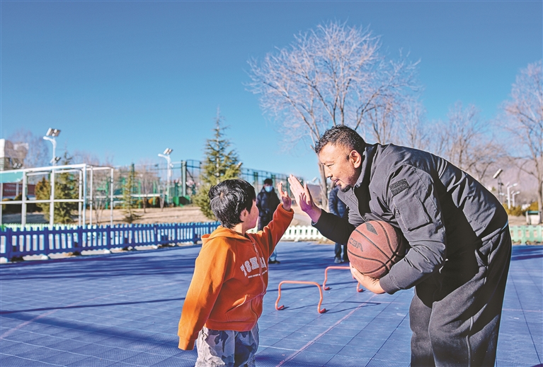 图为1月22日,在拉萨市全民健身体彩公园,“阳光残障儿童公益兴趣班”教师土旦格桑在体适能训练课程间隙与一名残障儿童击掌。新华社记者 丁增尼达 摄