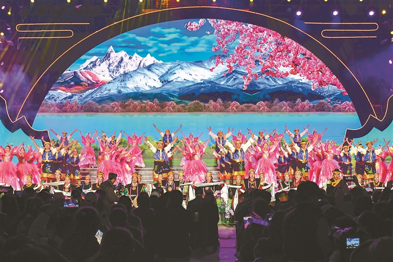 图为林芝市第二十三届桃花旅游文化节开幕式演出《遇见·幸福林芝》节目表演现场。记者 刘枫 摄