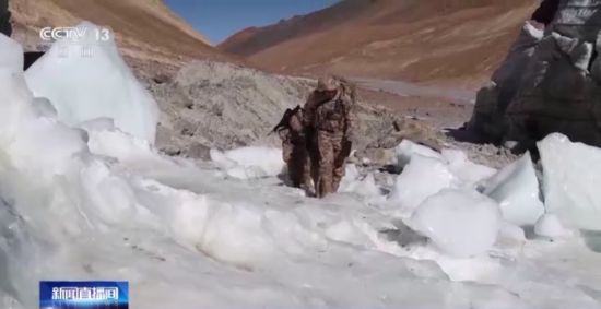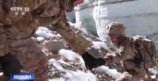 经过一个多小时的车行颠簸,巡逻分队到达了车行道路的终点,接下来的徒步巡逻才是此次巡逻挑战的开始。翻越海拔6000米的冰川,这对于常年驻守的官兵们来说也是极大的挑战,行进途中稍不注意就会摔倒在地,即便是经验丰富的老兵走在上面也时常手脚并用才能前行。