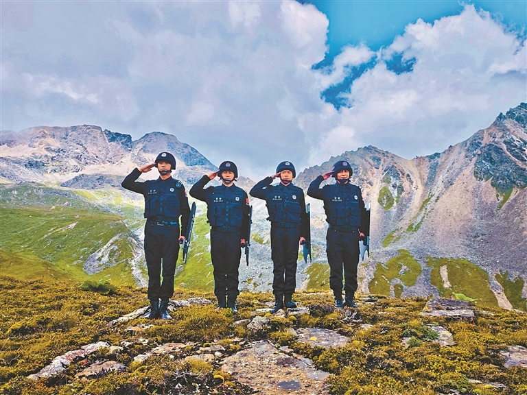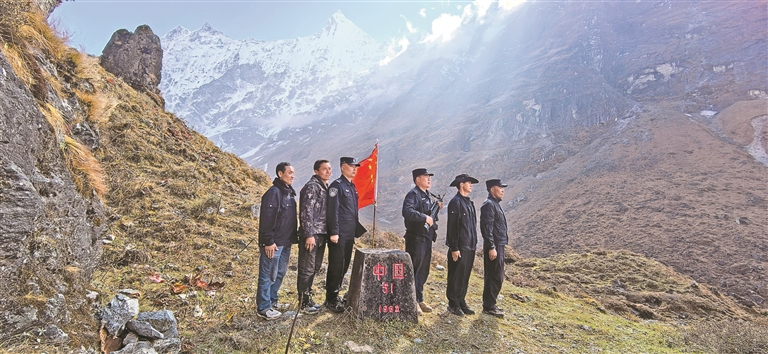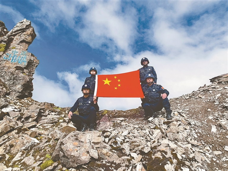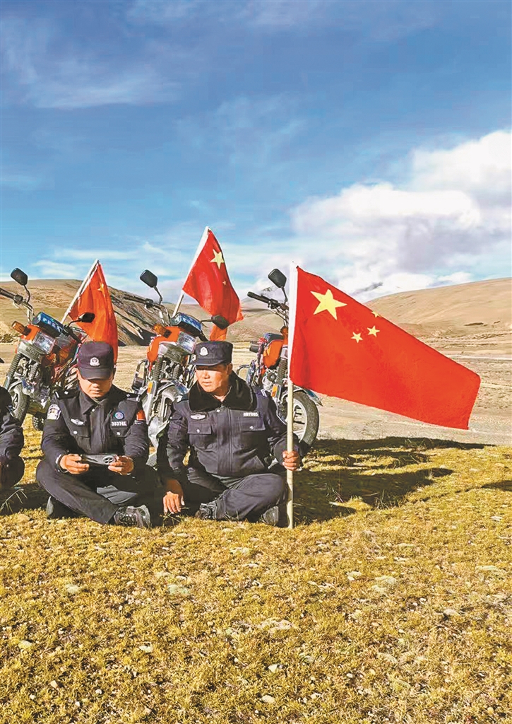 日喀则边境管理支队康布边境派出所民警在边境一线与国旗合影。记者 王敏 通讯员 周伟 摄