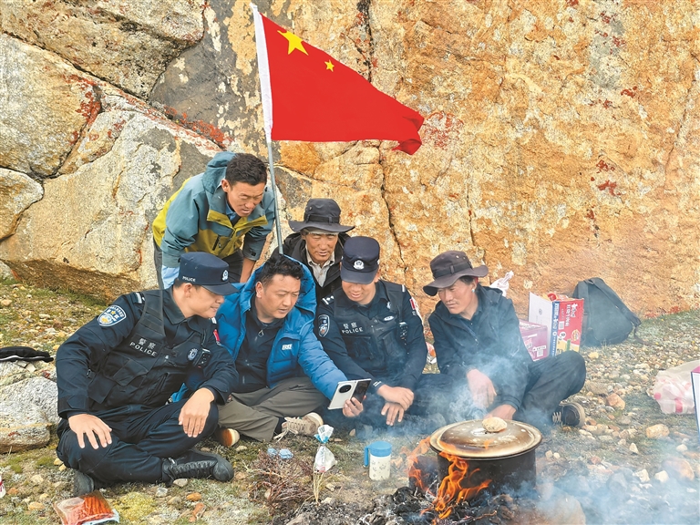 日喀则边境管理支队琼孜边境派出所民警联合乡政府工作人员前往山口巡逻间隙收看西藏自治区成立60周年庆祝大会。记者 王敏 通讯员 李杰夫 摄
