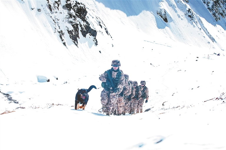 山南军分区某部军犬同巡逻分队战士一起巡边。记者 唐斌 通讯员 张照杰 摄