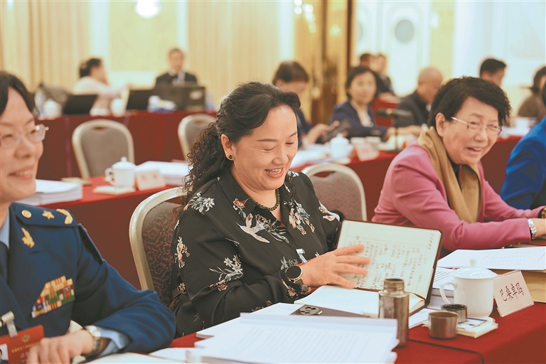 3月8日,全国政协委员巴桑卓玛(中)参加所在界别小组讨论。记者 陶玥 摄