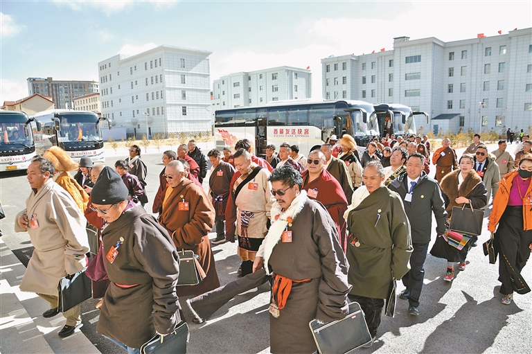 出席政协第二届那曲市委员会第五次会议的政协委员有序步入会场。记者 汪纯 摄