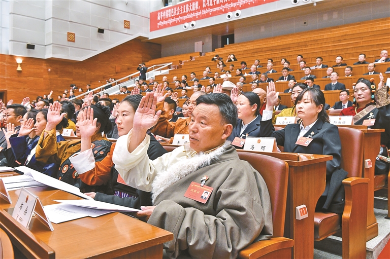 图为自治区人大代表在会上举手表决各项决议草案。记者 次仁平措 摄