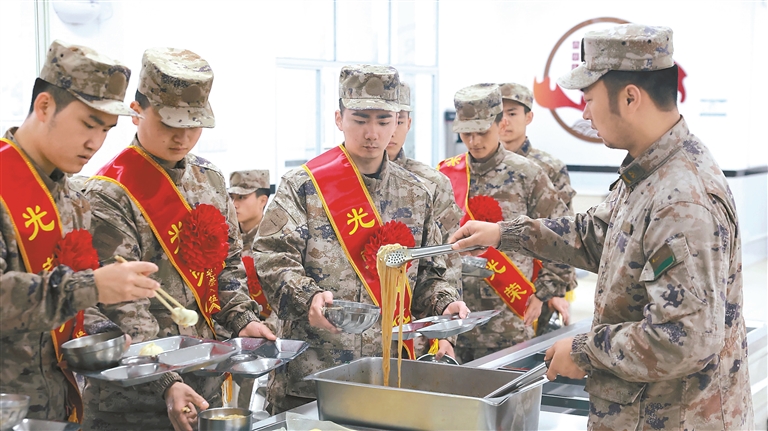新兵踏入军营的第一餐。一通通平安电话缓解了新兵的思乡情绪和远方亲人的担忧。