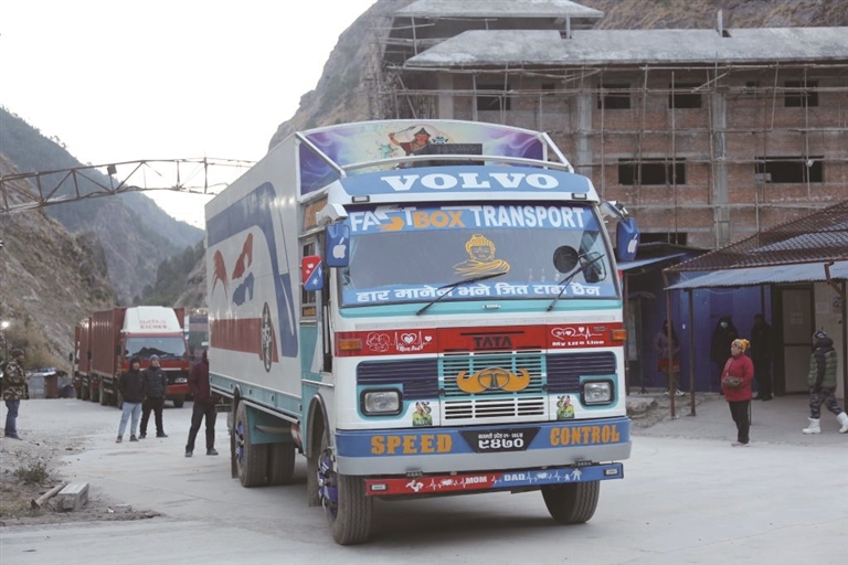 2026年1月1日,在尼泊尔热索瓦口岸,一辆卡车等待通过热索临时便桥进入中国吉隆口岸。新华社记者 张平 摄