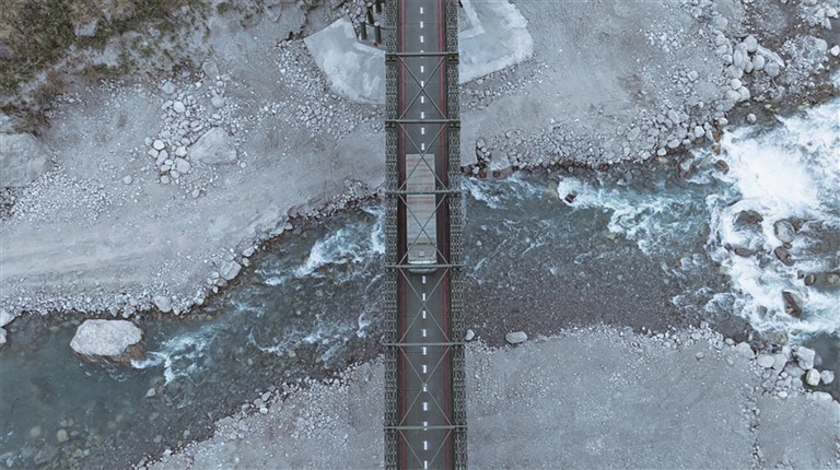 2026年1月1日拍摄的中国吉隆口岸和热索临时便桥(无人机照片)。新华社记者 丁增尼达 摄