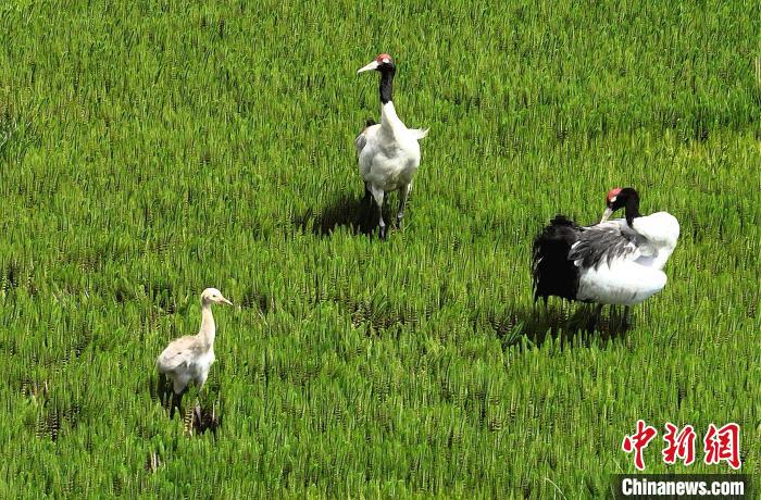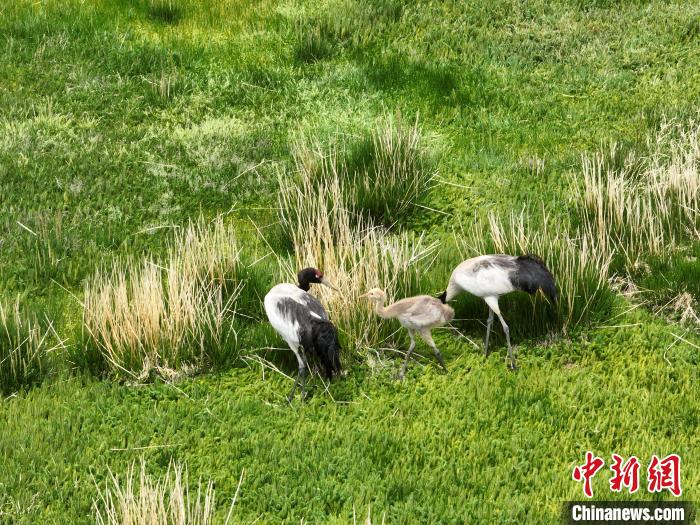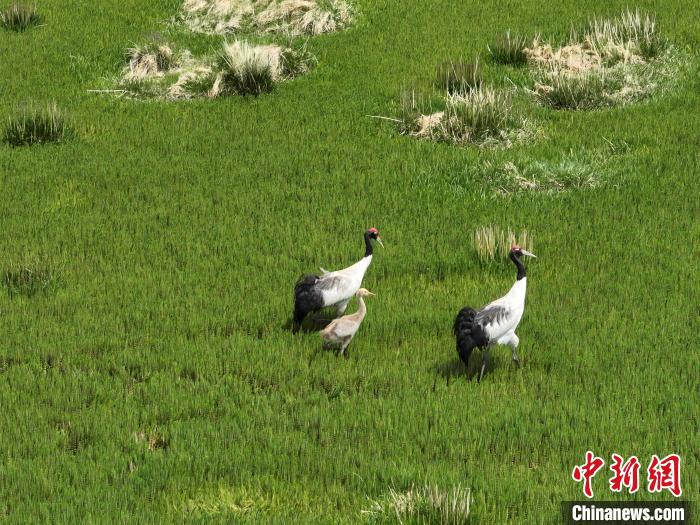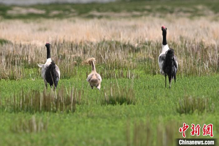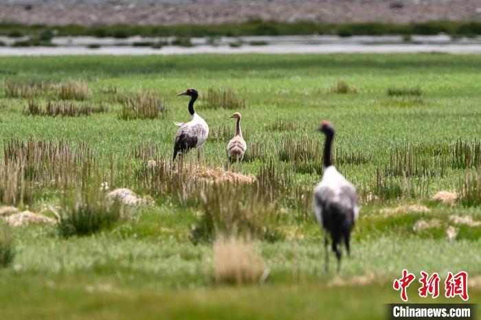 7月10日,在海拔4700米的西藏自治区那曲市申扎县湿地里,黑颈鹤一家在悠闲觅食。黑颈鹤是中国国家一级重点保护野生动物,属高原特有鹤类,主要栖息于海拔2500米至5000米的高原沼泽地、湖泊及河滩等湿地环境。每年四月起,成对的黑颈鹤陆续飞抵西藏自治区那曲市申扎县,在此繁育后代。近年来,申扎县持续加强生态修复,湿地面积扩大、水质改善,为黑颈鹤等珍稀物种提供了理想家园。中新社发 毛建军 摄