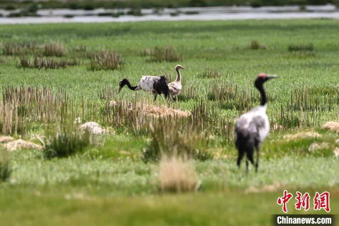 7月10日,在海拔4700米的西藏自治区那曲市申扎县湿地里,黑颈鹤一家在悠闲觅食。中新社记者 贡嘎来松 摄