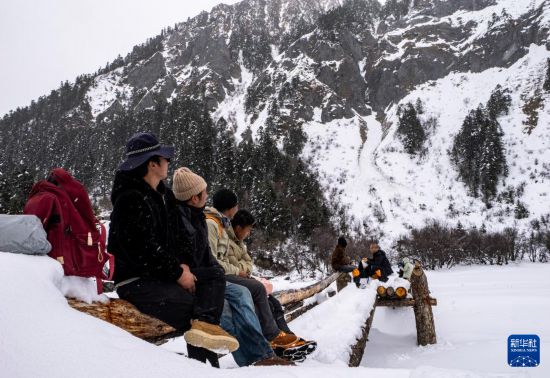 3月21日,当地向导和游人一起在白普隆沟牧场的木桥上休息。新华社记者 普布次仁 摄