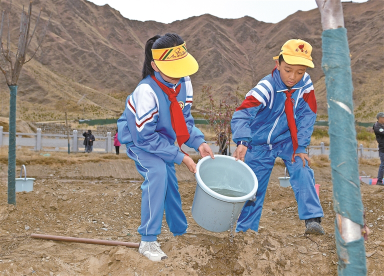 拉萨市第一小学学生在城关区慈觉林植树点参加春日植树活动。记者 潘多 洛桑 摄