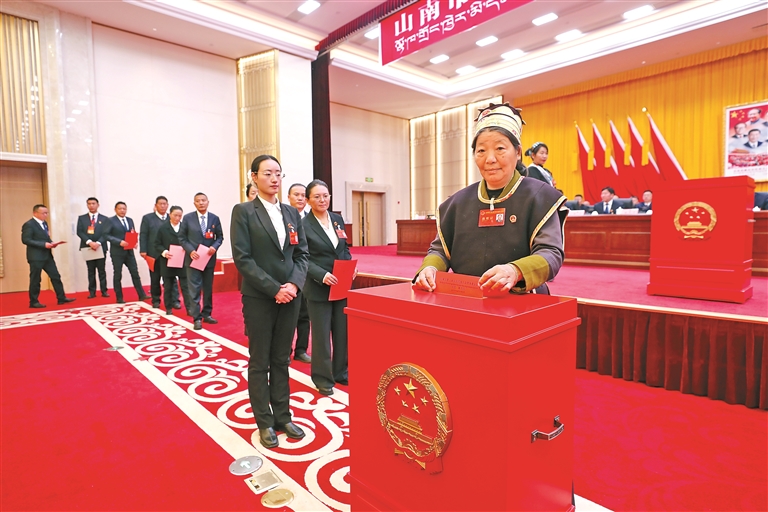 图为山南市人大代表投票选举新一届山南市人大常委会主任、副主任及委员。