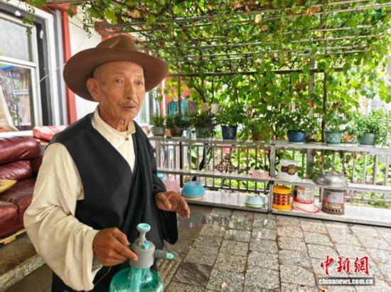 7月22日,罗布在家中前院介绍自己嫁接的葡萄。中新社记者 程小路 摄