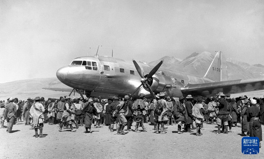 1956年5月26日,北京—拉萨航线试航成功。图为飞机在当雄机场降落后,受到藏族人民热烈欢迎的情形。新华社记者 钱嗣杰 摄