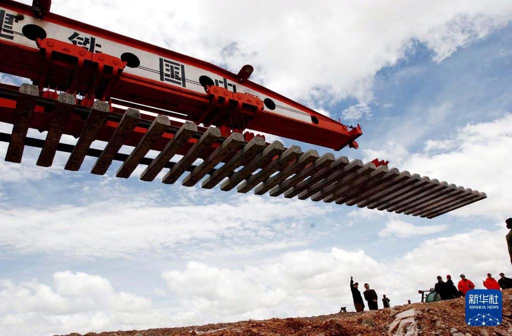 2004年6月22日,西藏境内第一段铁路轨排在安多火车站铺下,铁轨将从这里向拉萨继续延伸。当日,青藏铁路西藏境内正式开始铺轨。新华社记者 觉果 摄