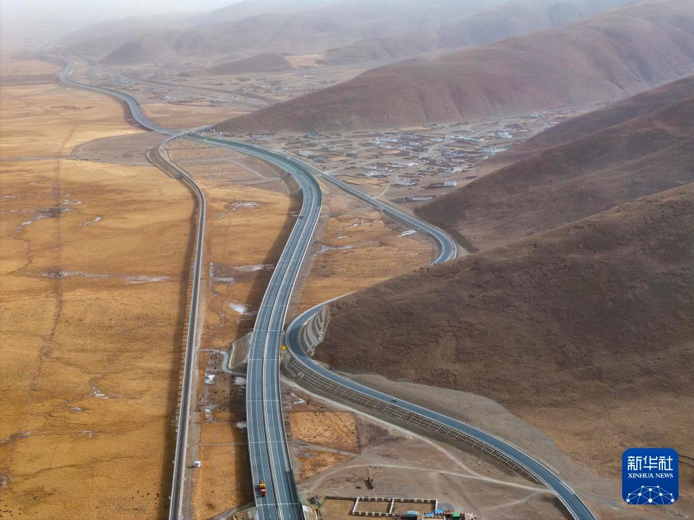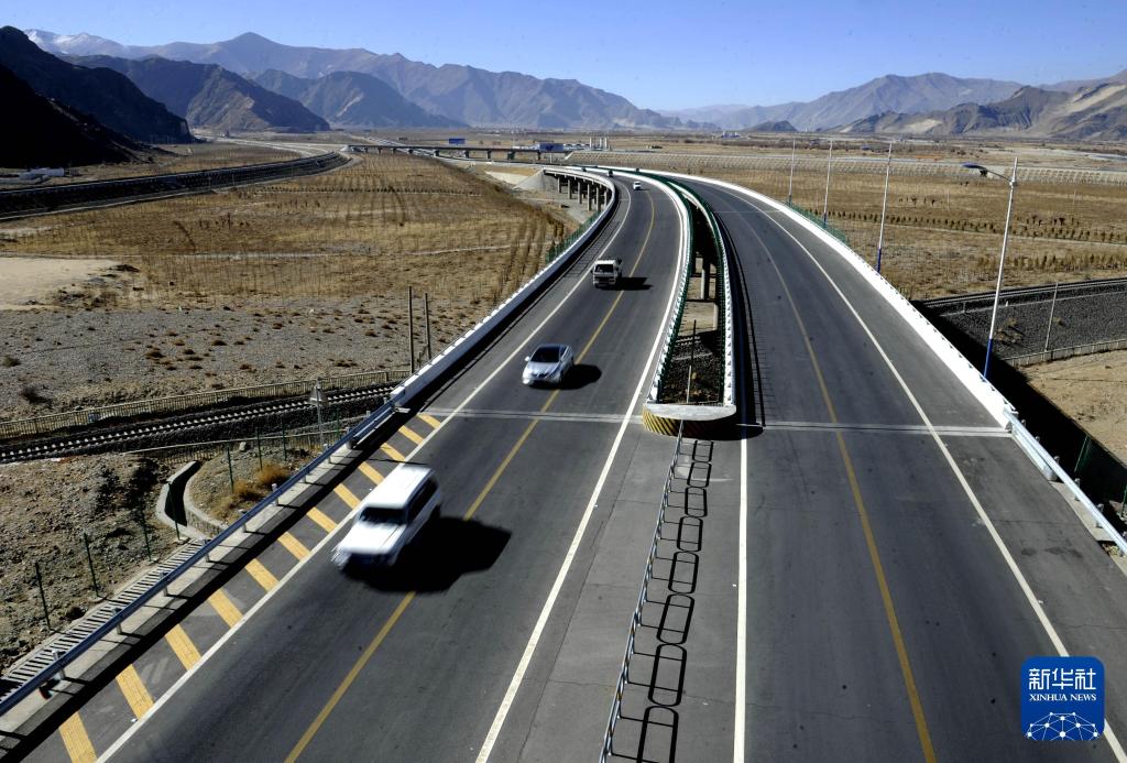 2024年12月8日在当雄县拍摄的青藏公路(右)、京藏高速(中)和青藏铁路并行的景象。新华社记者 姜帆 摄