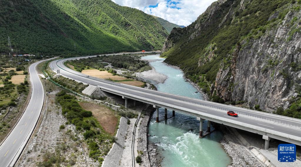 2024年9月3日拍摄的拉林(拉萨至林芝)高速及仍在使用中的老路(左)。新华社记者 晋美多吉 摄