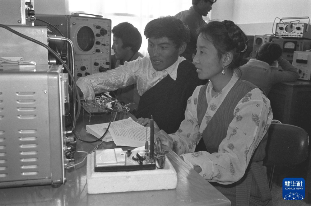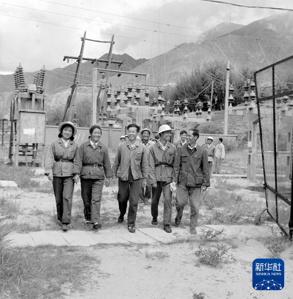 1980年8月,在拉萨东郊纳金电站,汉族电工师傅黄国民(前右一)、刘圣荣(前右三)与藏族电工班长卓嘎(左二)一起交流。新华社记者 刘前刚 摄