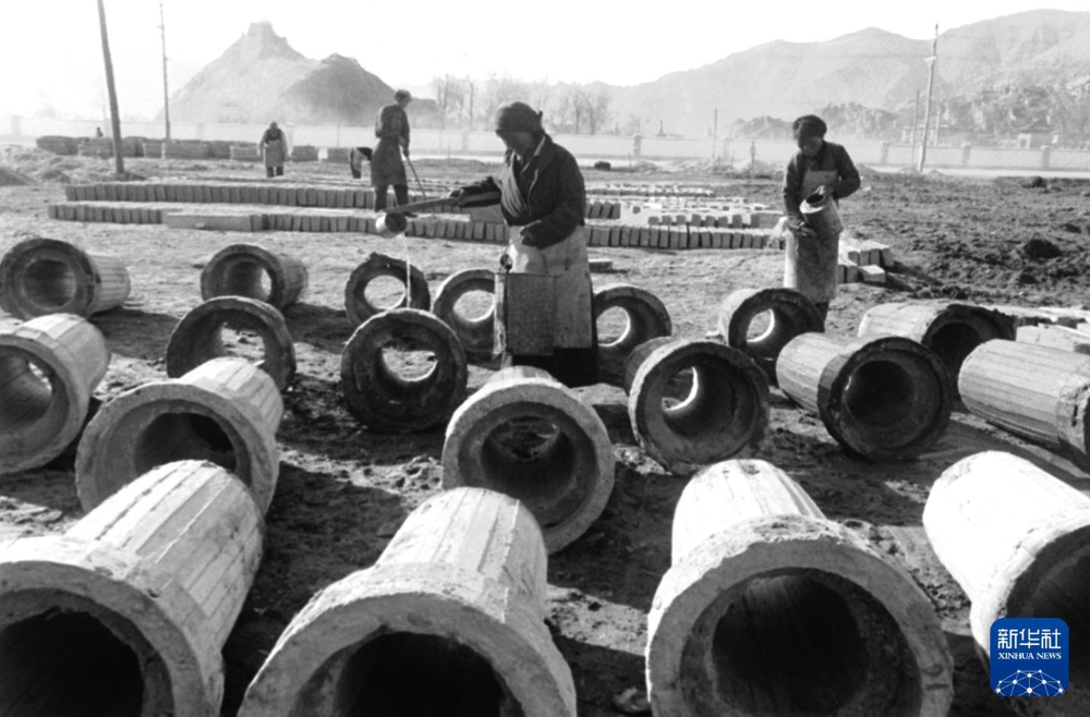 1964年,工人们在拉萨水泥厂浇水养护水泥管道。新华社记者 吴祖政 摄