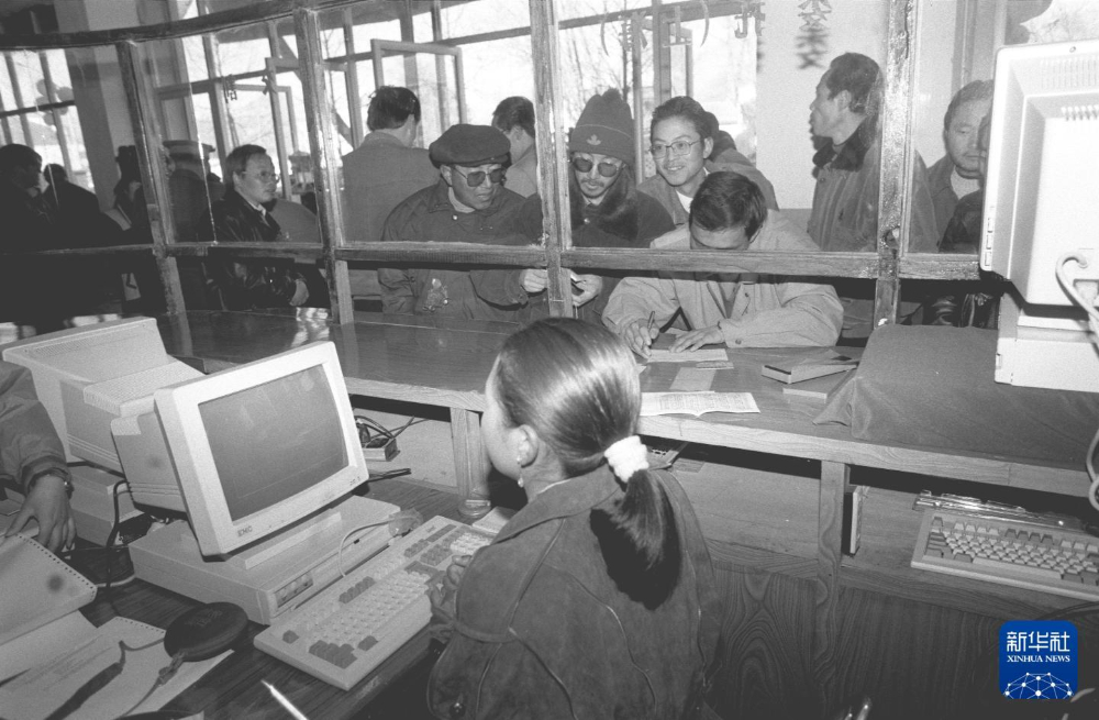 1991年,昌都邮电综合大楼营业厅内业务繁忙。新华社记者 陈燮 摄