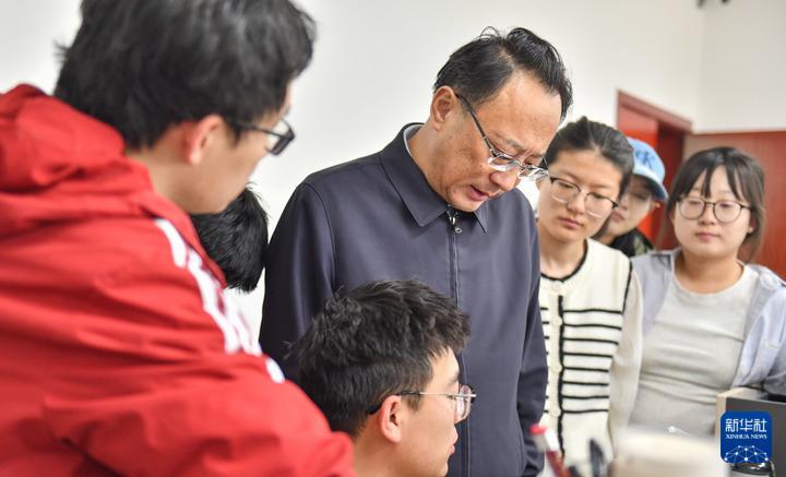2024年5月30日,中国工程院院士、西藏大学教授尼玛扎西(中)和他的学生在讨论藏汉实时翻译小程序运行情况。新华社记者 晋美多吉 摄