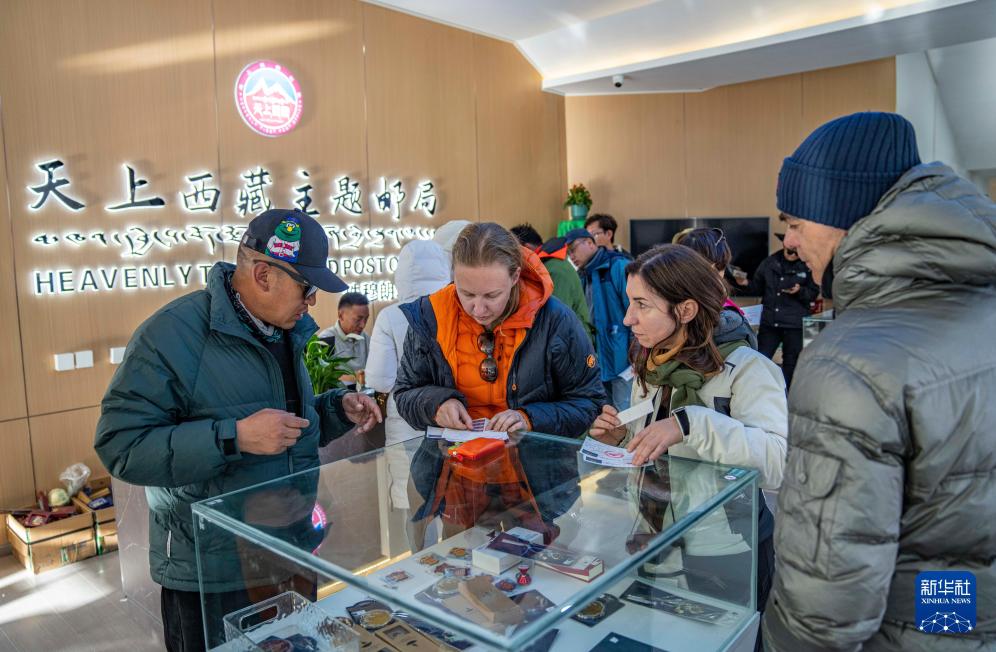 2024年5月24日,在位于珠峰游客大本营的天上西藏主题邮局,外国游客往明信片上贴邮票。新华社记者 孙非 摄