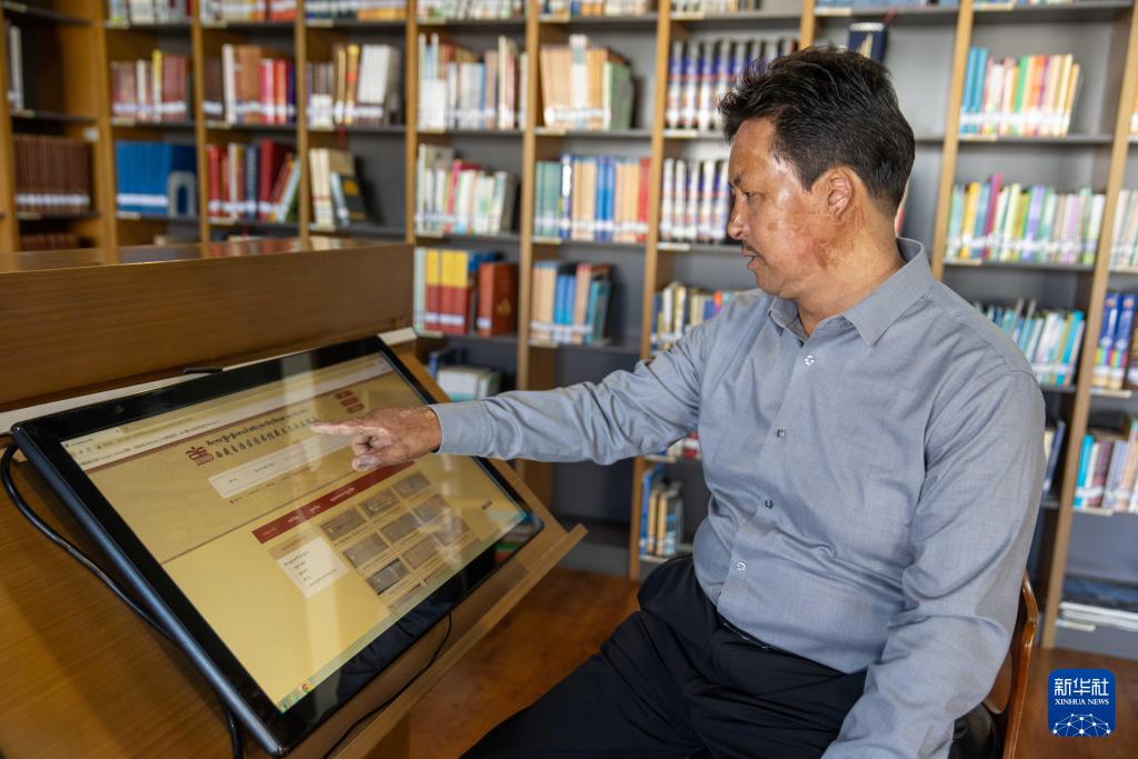 2025年8月13日,西藏自治区图书馆副馆长边巴次仁在展示数据库中的藏文古籍。新华社记者 旦增尼玛曲珠 摄