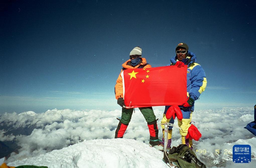 1999年,西藏登山队队员仁那(右)和吉吉站在珠峰顶上。他俩成为中国第一对同时登上珠峰的夫妻。新华社发