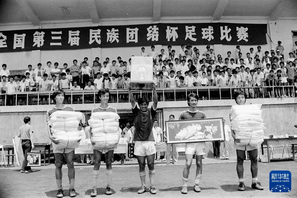 1985年,西藏自治区足球队获得全国第三届民族团结杯足球赛冠军。新华社记者 周浩荣 摄