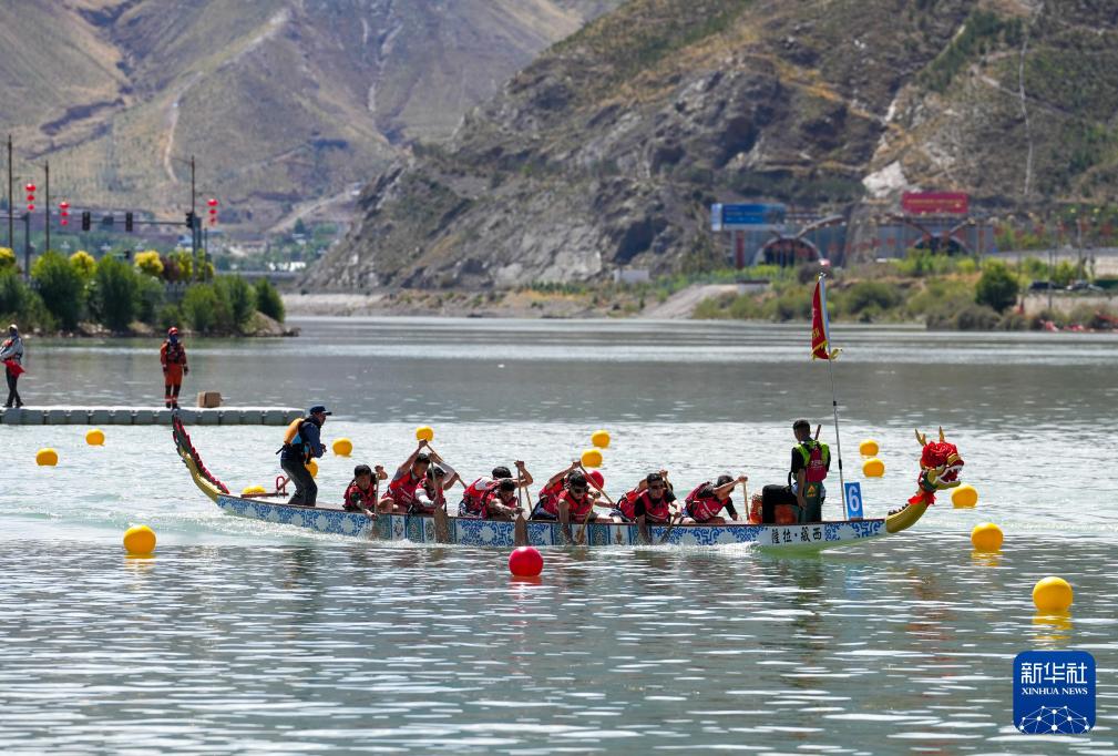2025年5月31日,参赛队伍在拉萨滨河公园水域参加端午节牛皮船(龙舟)赛。新华社记者 晋美多吉 摄
