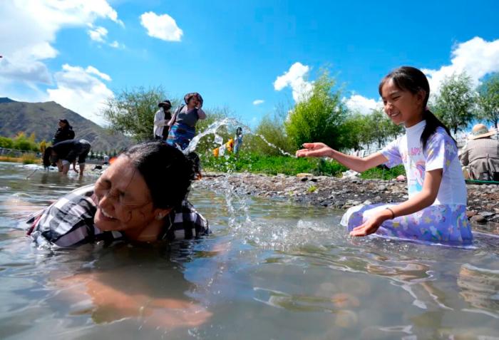 2025年9月13日,民众在拉萨河边享受沐浴节时光。沐浴节,藏语称为“嘎玛日吉”。中新社记者 李林 摄
