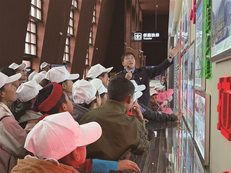 在团中央统战部、团西藏区委、西藏少工委、拉萨铁路办事处团工委的组织下,同学们循着时光的痕迹,在绿巨人动车旁、文化长廊中、沙盘模型前,沉浸式感受西藏自治区成立60年来的发展巨变,让民族团结的种子在心中深深扎根。