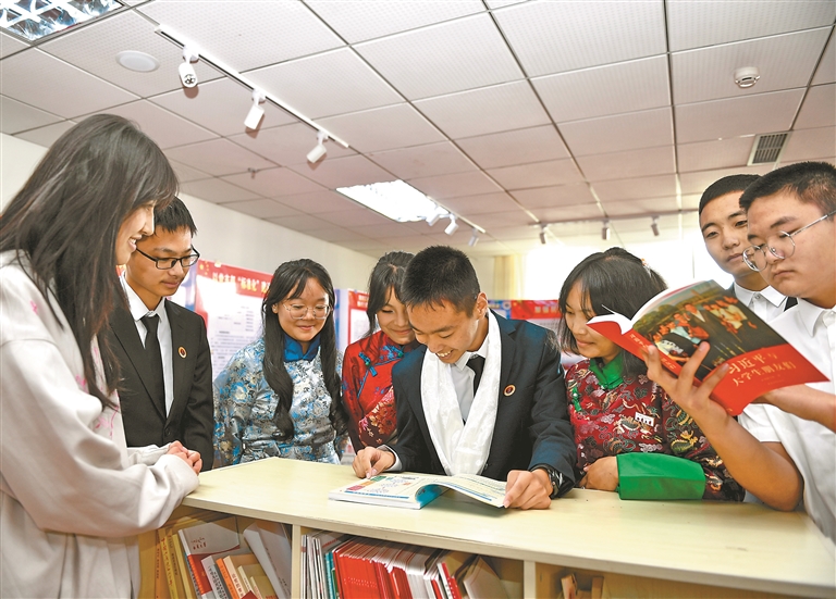 西藏大学汉族学生和藏族学生在交流讨论书本中的知识。