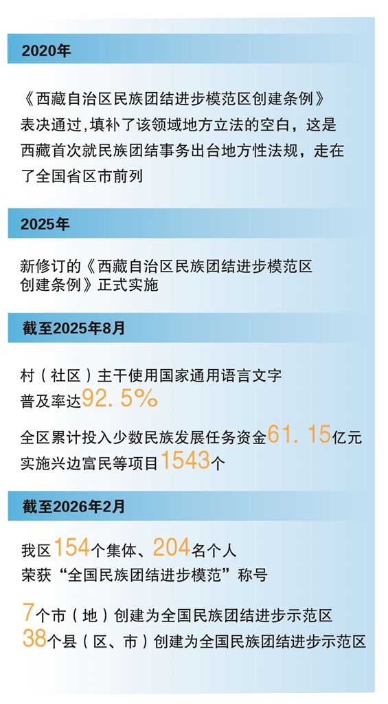 数据背后,是制度性保障的刚性支撑。我区先后出台《西藏自治区民族团结进步模范区创建条例》《西藏自治区民族团结进步模范区创建规划(2021—2025年)》等,为促进民族团结进步事业提供了坚实制度保障。今年3月12日,《中华人民共和国民族团结进步促进法》表决通过。正如自治区社会科学院副院长边巴拉姆所言,这部法律全面贯彻习近平总书记关于加强和改进民族工作的重要思想,将“十二个必须”要求转化为国家意志,同时也为西藏民族团结进步事业提供了强劲的法治保障。