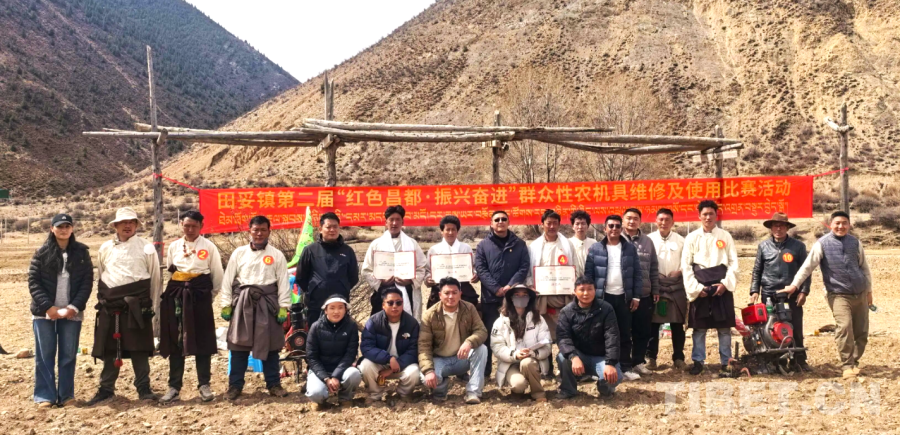 昌都市左贡县田妥镇第二届“红色昌都·振兴奋进”群众性农机具维修及使用比赛颁奖现场,获奖选手手持奖状与农机奖品合影。