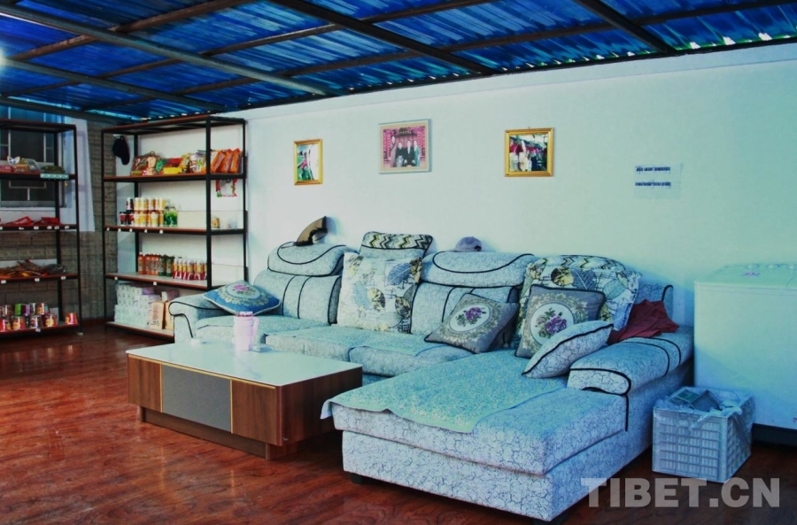 尼吉拉姆家在陕西援建边境小康示范新居的一排排楼房中靠路边一户。走进户门,院子搭着棚顶,形成了一个大的会客室,墙边一溜柜子,上边摆满饮料、生活用品等,就是一个小小的便民商店了。这只是尼吉拉姆“产业”中的一项,她和丈夫罗启明还经营一家养鸡场、两人都担任护边员等,加上国家边境补贴、草场补贴等,一年下来能有几十万元收入。