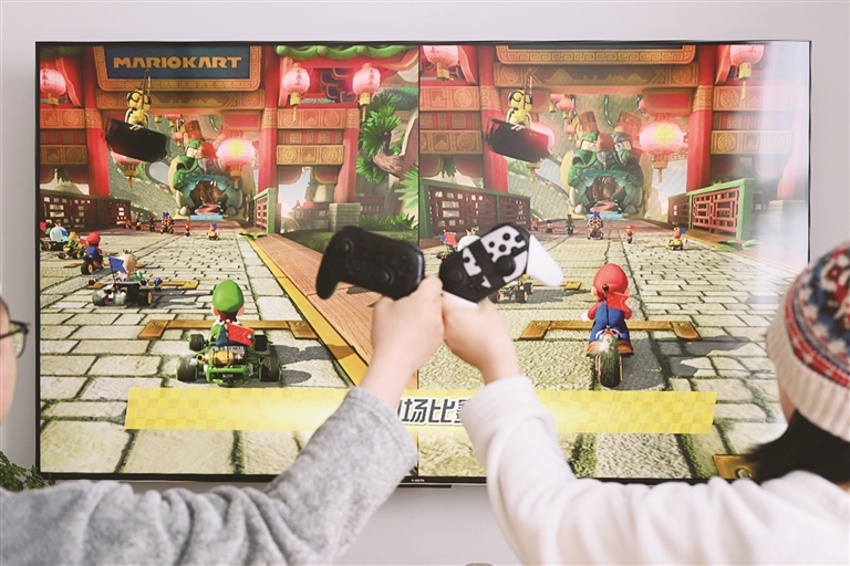 拉萨市民在家中体验任天堂经典游戏《马里奥赛车》。