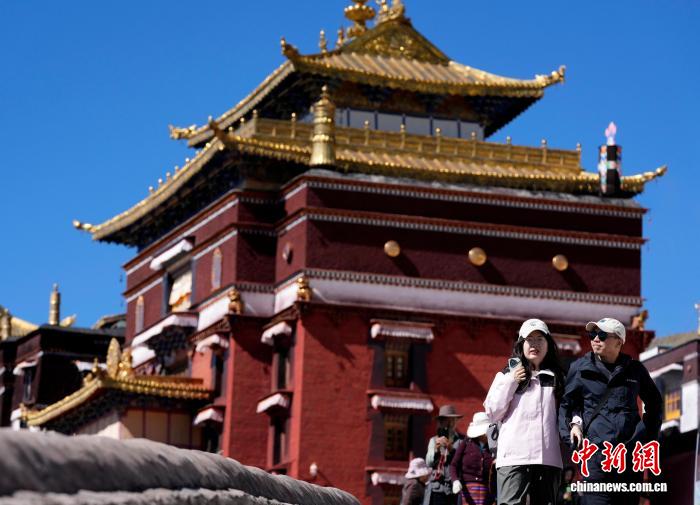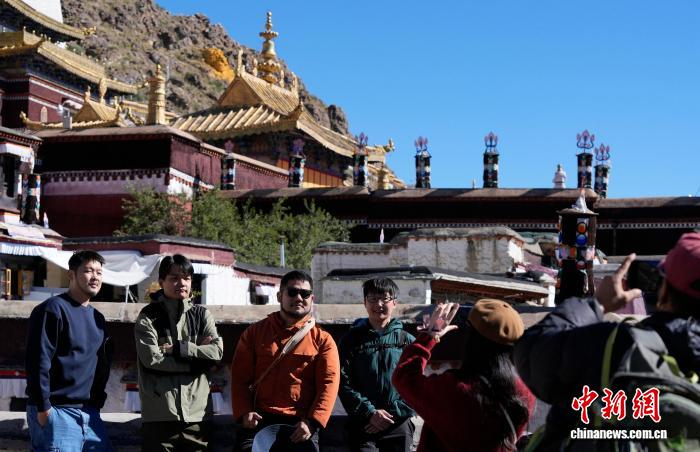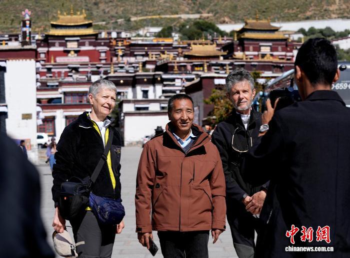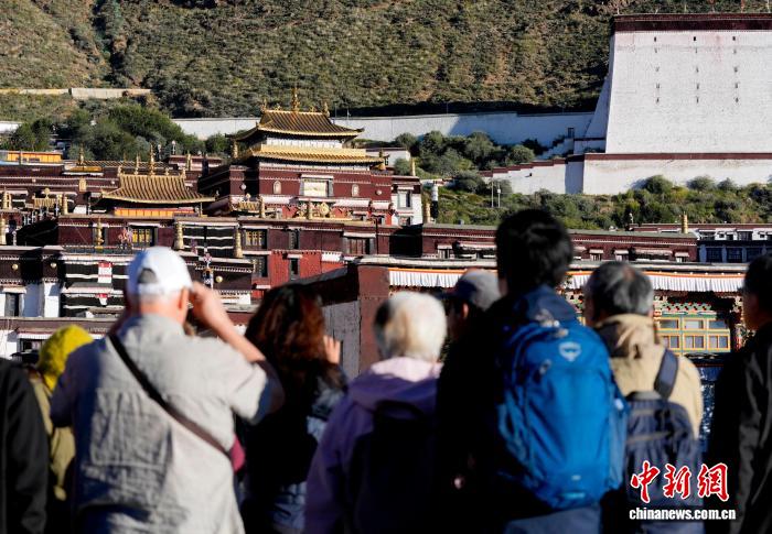 10月7日,外国游客在西藏日喀则市扎什伦布寺参观。扎什伦布寺始建于公元1447年,是中国国家5A级旅游景区。凭借深厚的历史底蕴和独特的文化魅力,吸引众多中外游客参观游览。中新社记者 李林 摄