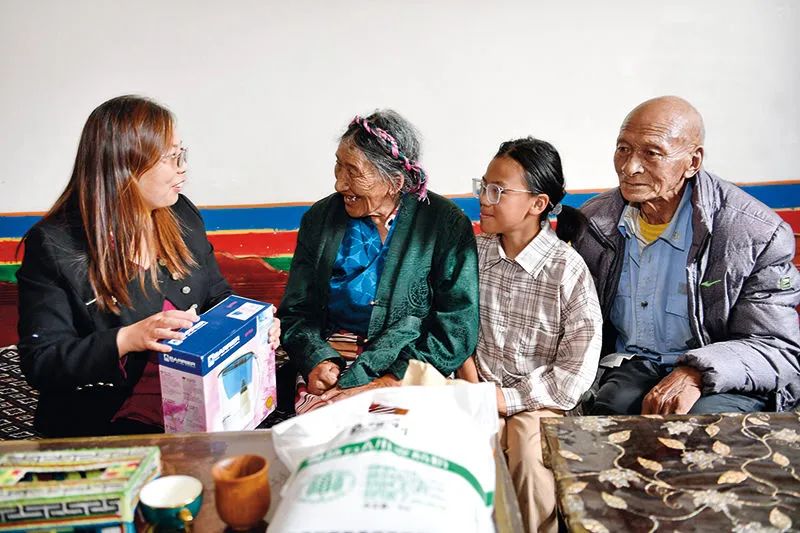 王玉秀(左一)来到拉萨市达孜区德庆镇次旦老人家走访并送上慰问品(2022年7月27日摄) 张汝锋摄/本刊