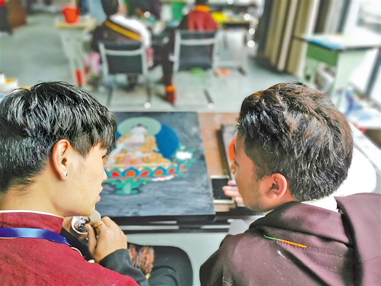 图为唐卡画师在交流唐卡漆画创作技巧。