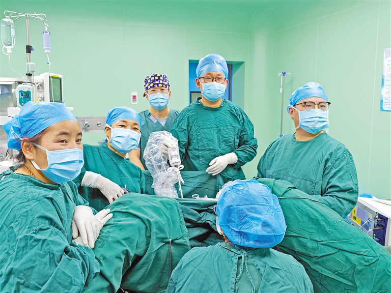 上海援藏医疗专家隋孟松(右一)带领本地妇科医生开展日喀则市首例腹腔镜下全子宫切除手术。