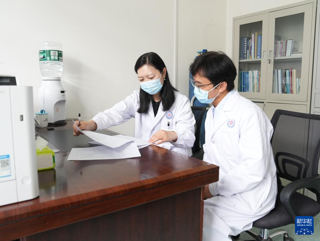 在西藏自治区人民医院,徐钟慧(左)与徒弟旦增晋美在办公室内交流(8月9日摄)。新华社记者 丁汀 摄