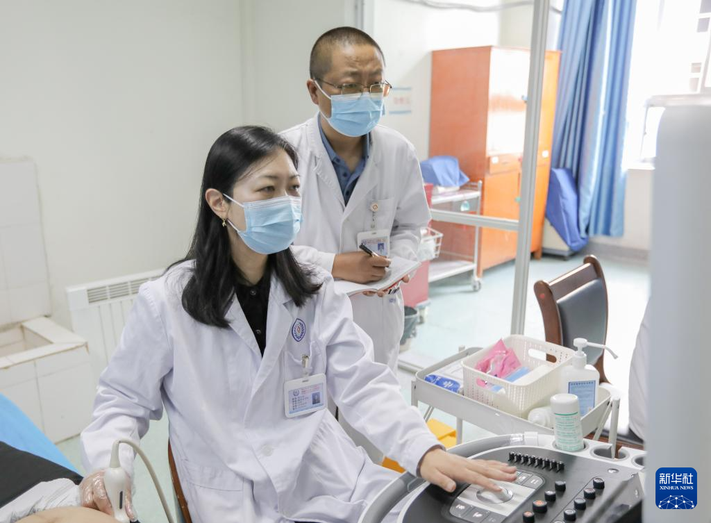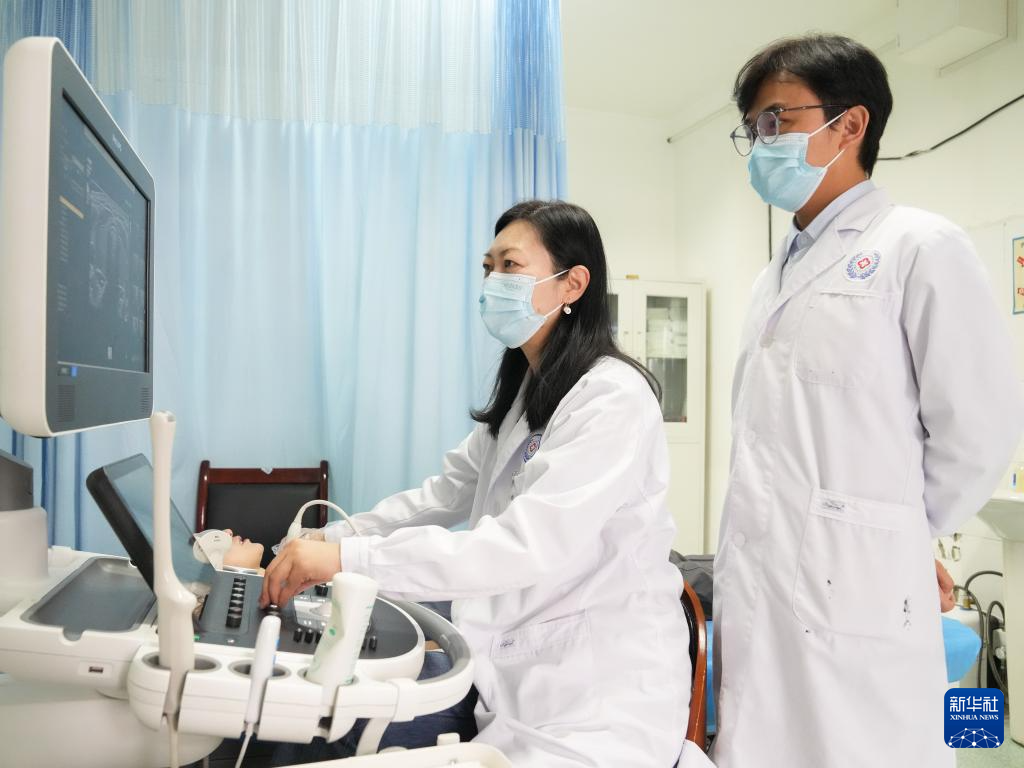 在西藏自治区人民医院,徐钟慧(左)与徒弟宋彬彬在为患者进行超声检查(7月12日摄)。新华社记者 丁汀 摄