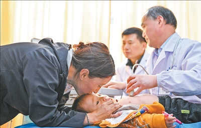 西藏山南市措美县中心医院,来自安徽医科大学第一附属医院的医生在为儿童做先心病筛查。