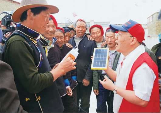 图为2017年7月20日,钱海军(右一)在西藏仁布县普松乡为当地农牧民群众介绍太阳能多功能自发电灯的使用方法。新华社记者 刘东君/摄